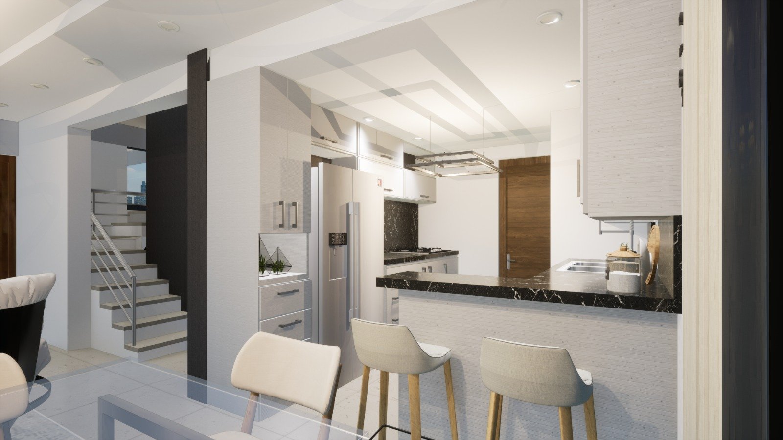 High-quality finishes: porcelain tile, modular kitchen, granite countertops, and a fine wood front door